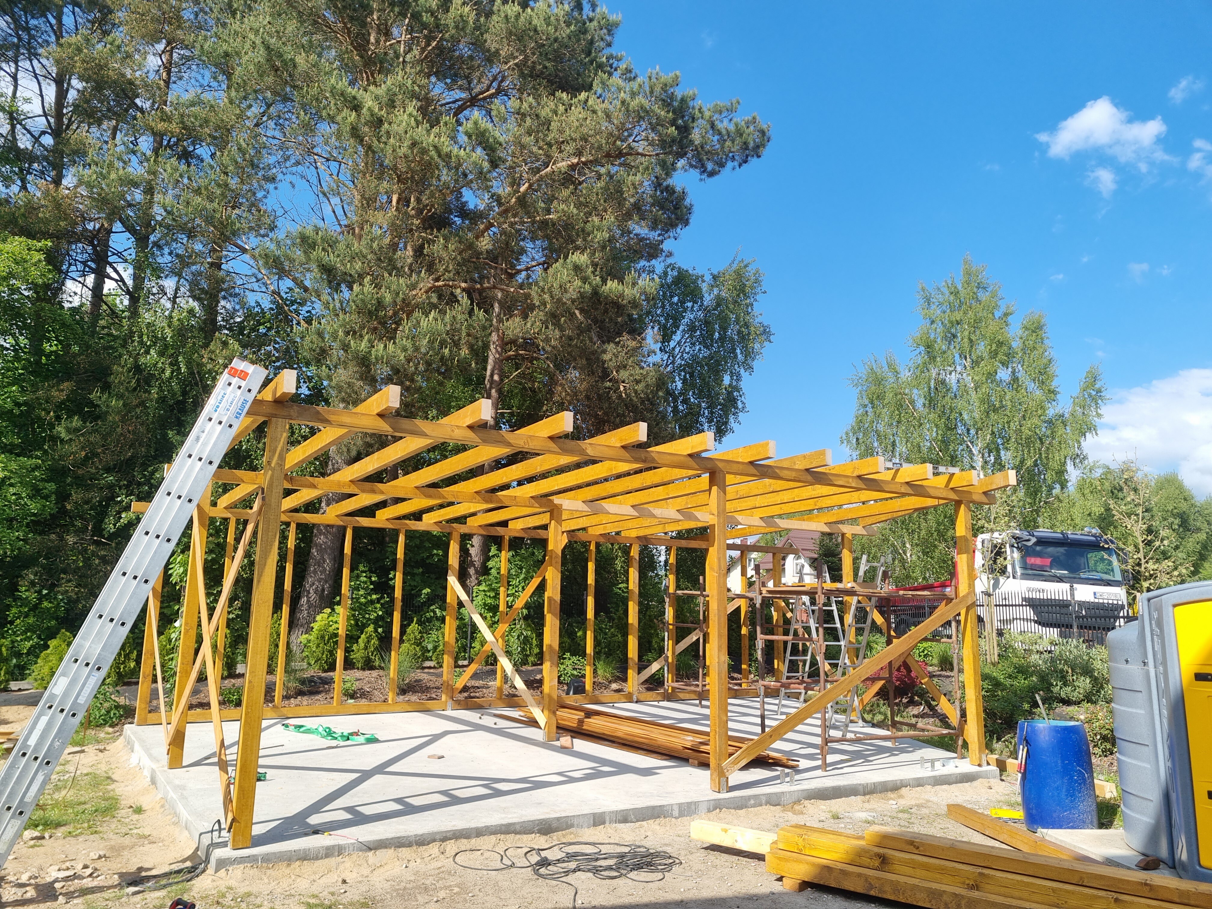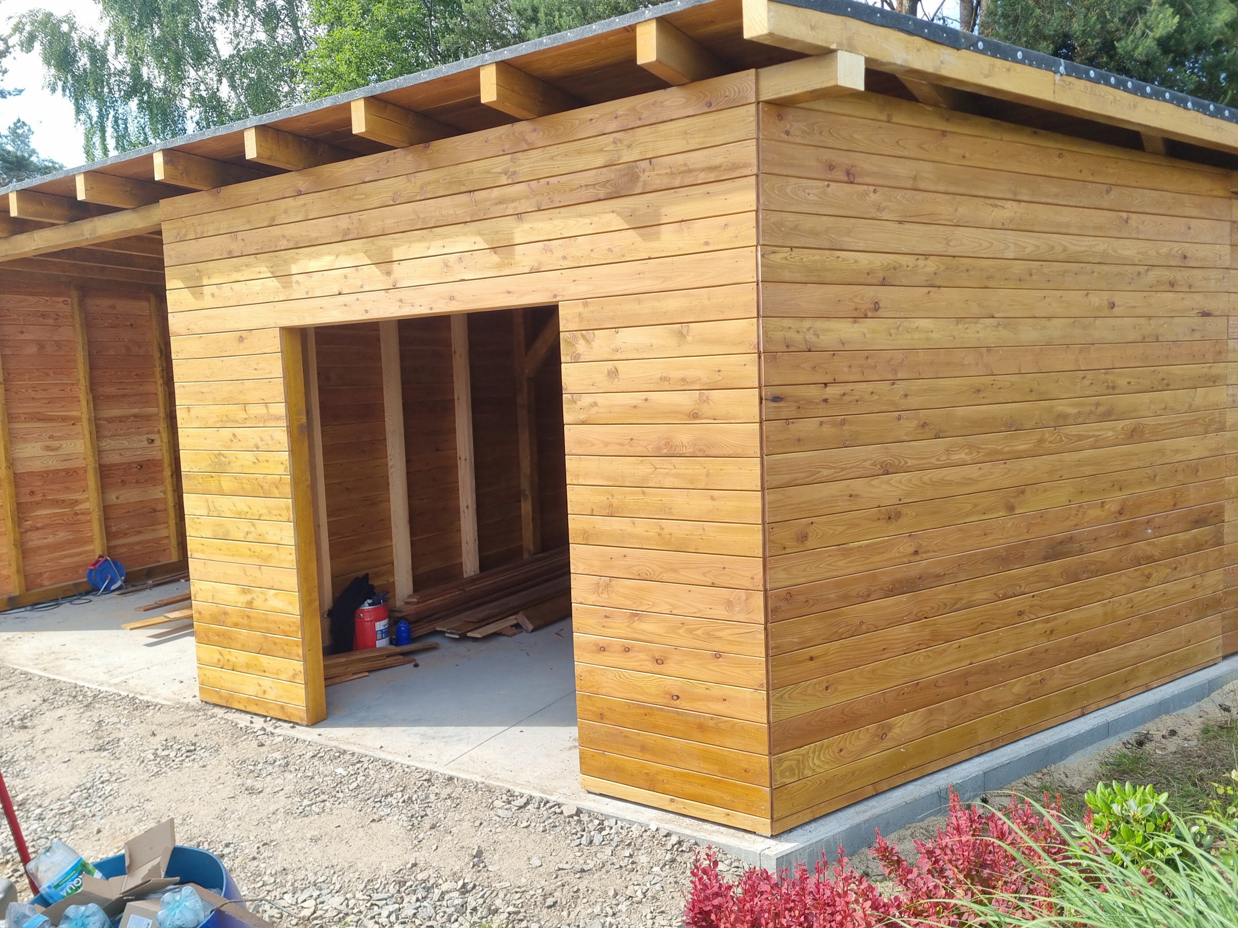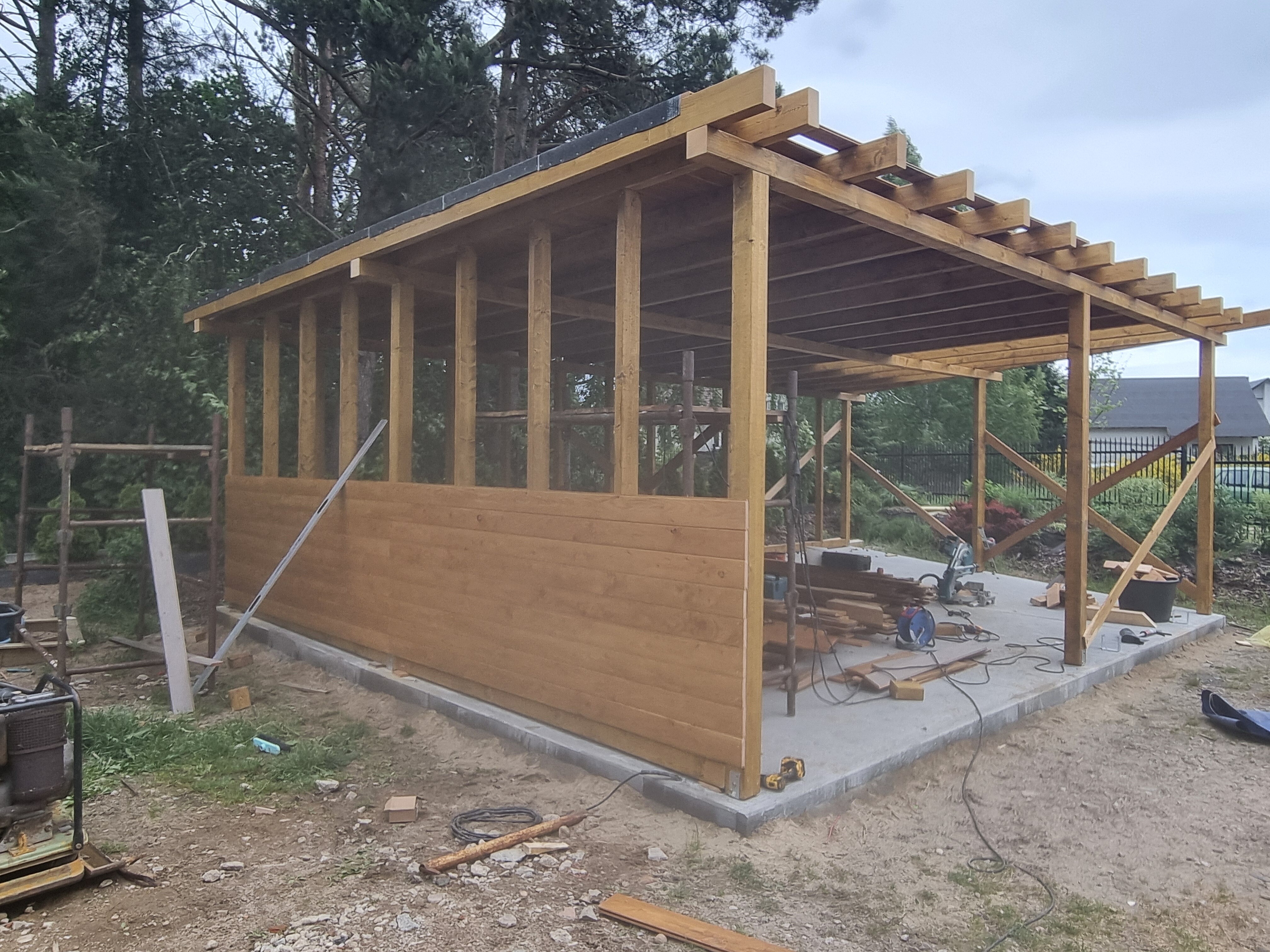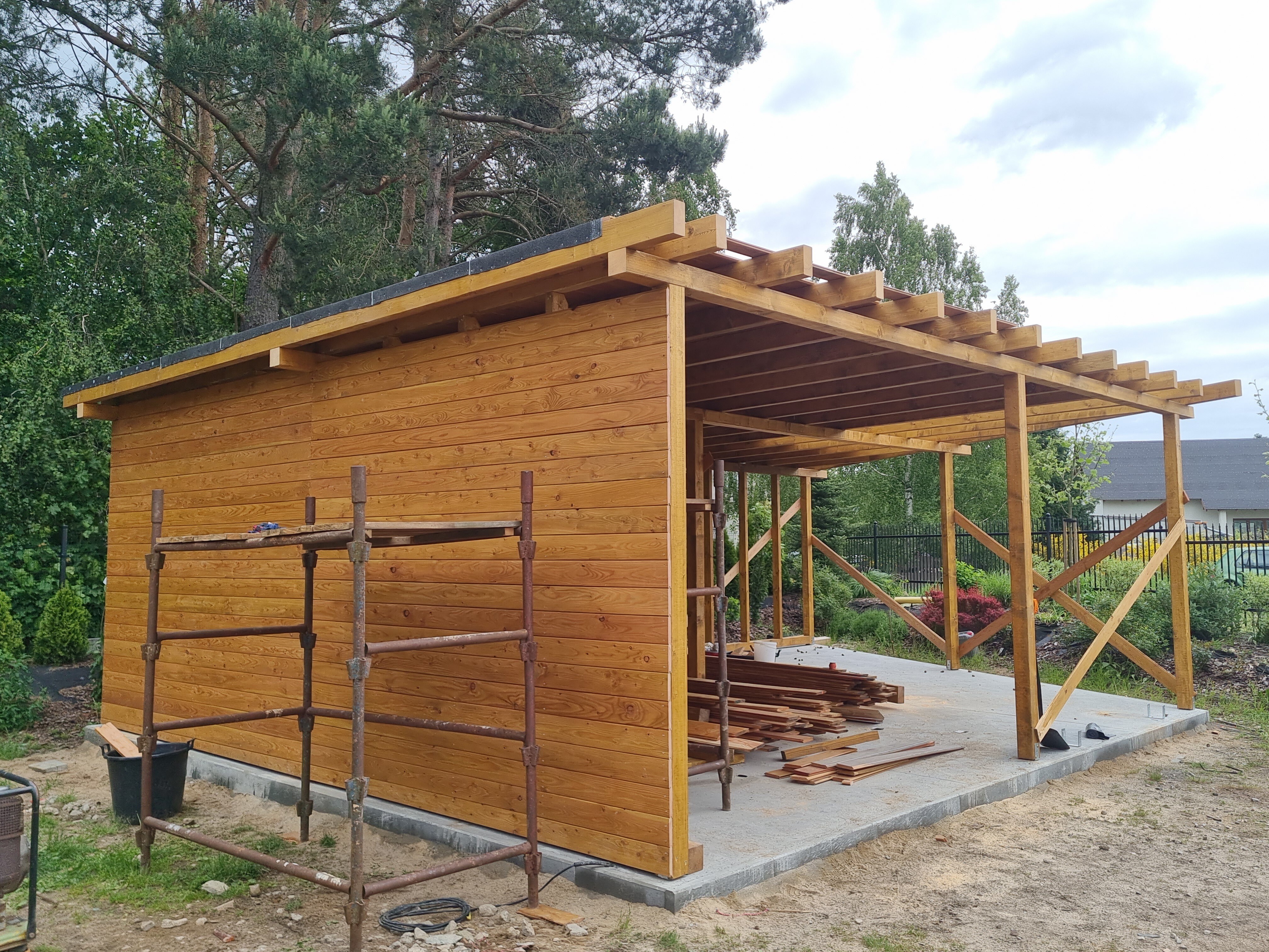 Nowa wiata, która zawiera również obszerne pomieszczenie gospodarcze, została zbudowana z wysokiej klasy drewna modrzewiowego, znanego z trwałości oraz estetycznego wyglądu. Cała konstrukcja została starannie pokryta blachą na rąbek, co nie tylko podkreśla jej elegancję, ale także zapewnia doskonałą ochronę przed niekorzystnymi warunkami pogodowymi. To wszystko świadczy o najwyższej jakości użytych materiałów oraz profesjonalnym wykonaniu. Warto zaznaczyć, że proces budowy był kompleksowy, obejmując wszystkie etapy, w tym solidne kotwy, które gwarantują stabilność i bezpieczeństwo całej struktury, co ma kluczowe znaczenie dla jej długoterminowego użytkowania.