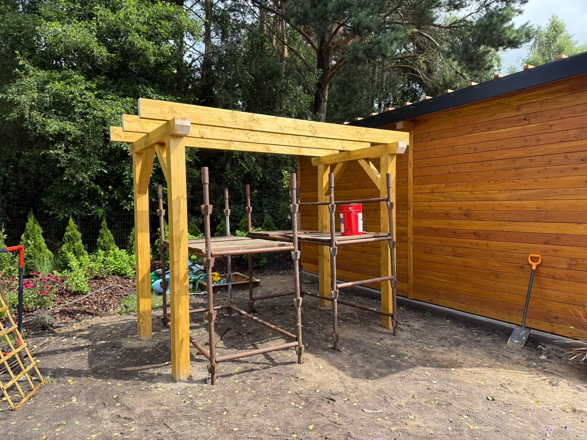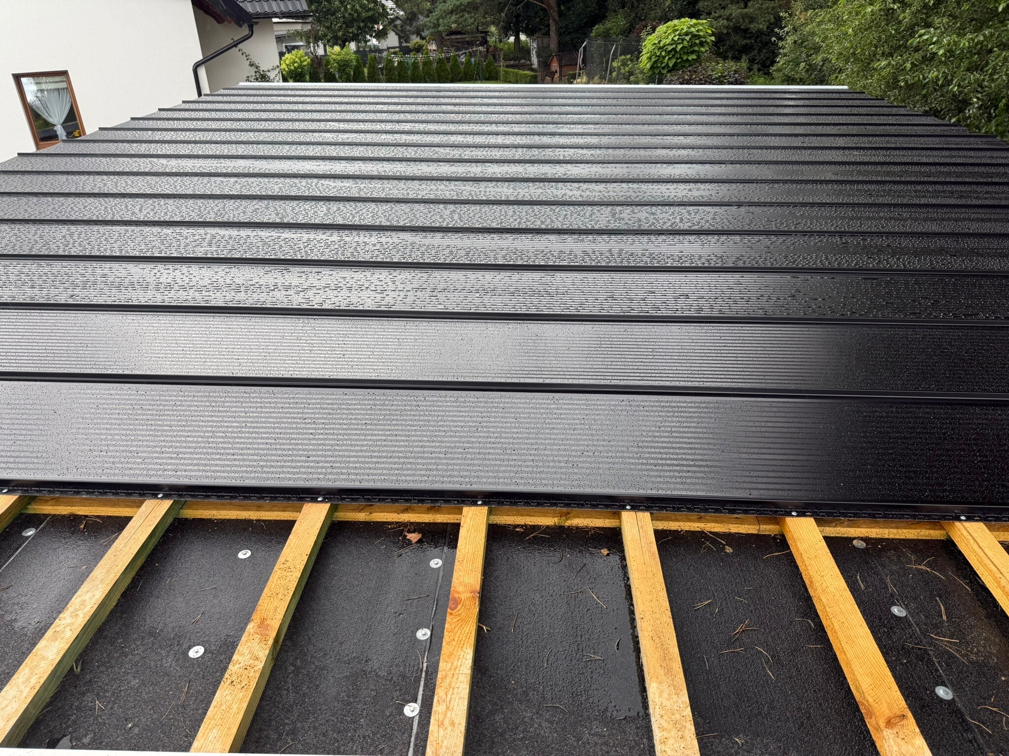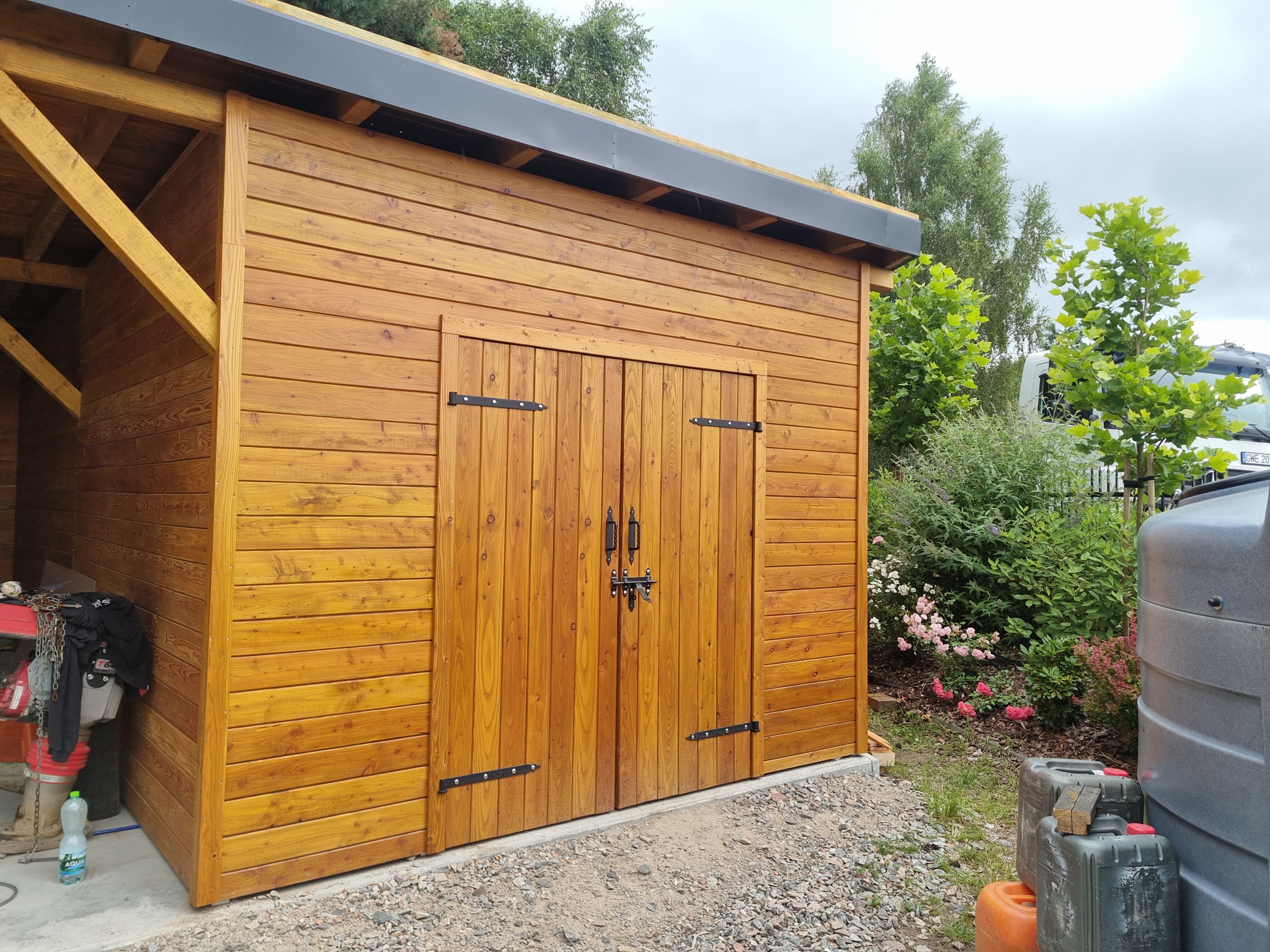 Nowa wiata, która zawiera również obszerne pomieszczenie gospodarcze, została zbudowana z wysokiej klasy drewna modrzewiowego, znanego z trwałości oraz estetycznego wyglądu. Cała konstrukcja została starannie pokryta blachą na rąbek, co nie tylko podkreśla jej elegancję, ale także zapewnia doskonałą ochronę przed niekorzystnymi warunkami pogodowymi. To wszystko świadczy o najwyższej jakości użytych materiałów oraz profesjonalnym wykonaniu. Warto zaznaczyć, że proces budowy był kompleksowy, obejmując wszystkie etapy, w tym solidne kotwy, które gwarantują stabilność i bezpieczeństwo całej struktury, co ma kluczowe znaczenie dla jej długoterminowego użytkowania.